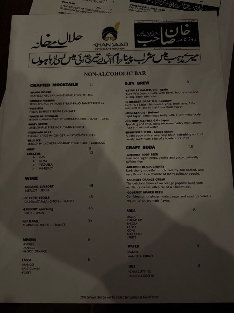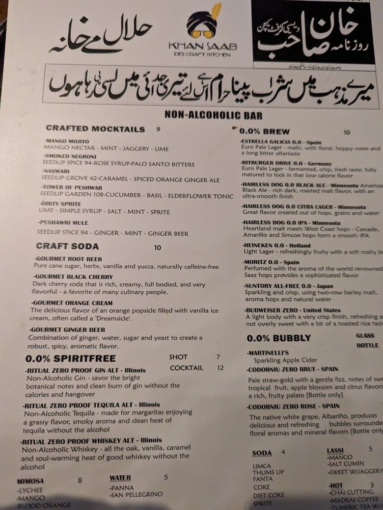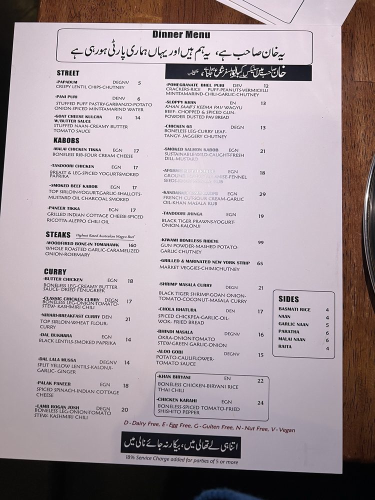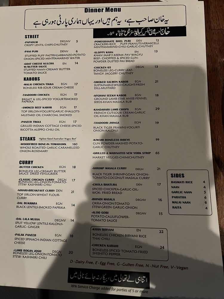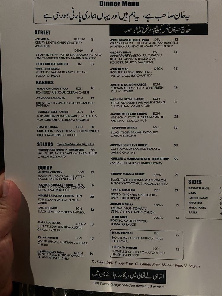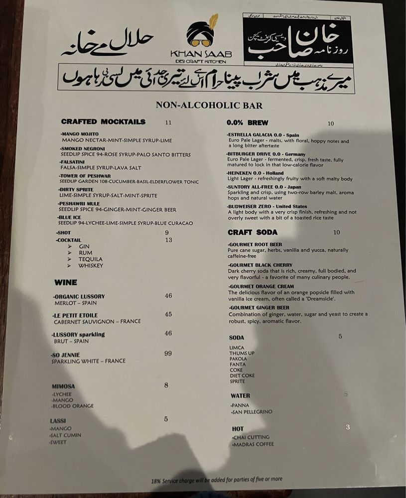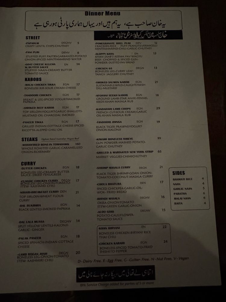 Introducing the menu at Khan Saab Desi Craft Kitchen, a Halal restaurant in Fullerton, CA, offering a range of dishes with unique flavors and upscale ambiance. From Afghani Seekh Kabob to Malai Chicken Tikka, the kabobs are a delight. The curry selection, including Butter Chicken and Classic Chicken Curry, promises a burst of traditional spices. Street food options like Pani Puri and Chicken Boneless leg offer a tasty experience. Customers rave about dishes like Sloppy Khans, Garlic/Malai Naan, Shrimp Masala Curry, and Smoked Beef Kebab for their delicious flavors. The contemporary take on Pakistani classics and exceptional service add to the overall dining experience. With rave reviews and a diverse menu, Khan Saab Desi Craft Kitchen is a must-visit destination for a unique and fulfilling culinary experience.
